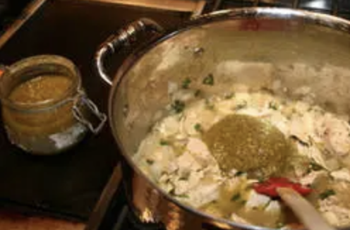 In a saucepan or large saute pan, saute remaining diced onion in 1 T. olive oil on medium heat until onions are tender, about 2-3 minutes. Add about 3 T. chopped cilantro and stir. Add reserved chicken meat and about 1 cup reserved broth along with 1-2 teaspoons of cumin (or to taste) and stir. Finally, add about 1 cup of the Jalapeno green sauce and stir. Season with salt and pepper.